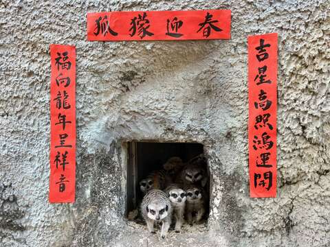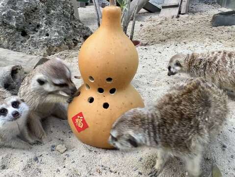 因應農曆春節,壽山動物園全體總動員,包含同仁、志工及保育員不但除舊布新進行環境景觀布置外,也規劃季節食蔬,準備豐富蔬果,邀動物們擔任座上賓一起享用。園方說,狐獴展場的春聯是由具書法專長的志工蔡忠州親筆揮毫、葫蘆玩具則是改造志工捐贈的家中珍藏藝品!好奇心強的狐獴一看到保育員端著菜籃走來,就興奮地探頭探腦。當保育員將菜籃放在展場內,狐獴們立刻圍了上來,藉由翻動葫蘆讓麵包蟲掉出洞口,增加狐獴攝食的趣味性及延長進食的時間,增加其活動力。
