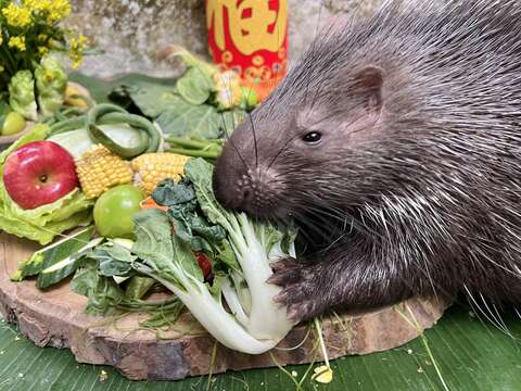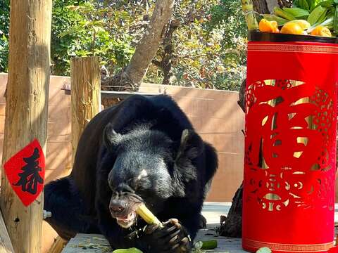 去年新生的冠豪豬「小芋頭」,在保育員細心照料下光速成長,體型幾乎快追上爸媽了,第一次過年的牠一見到澎湃的年節大餐,馬上衝出來優先品嚐,完全將長幼有序拋諸腦後,其它家族成員則是慢條斯理一一入座,像極了過年團聚的大家族。黑熊「波比」熊生第一次見到白甘蔗,不顧保育員悉心搭配的五行蔬果,興奮狂嗑起來,讓保育員好氣又好笑。去年獸醫團隊為「波比」裝上的銀色牙套,剛好做了最好的硬度測試,而甘蔗糖份偏高,所以園方只會在年節應景讓動物們稍微嚐鮮作為加菜的小確幸。