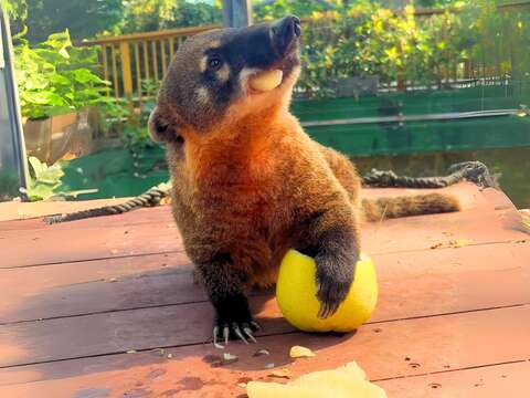 高閔琳補充說,最搶鏡頭的紅毛猩猩「阿宏」披上紅色披風開箱中秋禮盒,大口品嚐清爽多汁的柚子,還不時望向鏡頭,彷彿在以眼神傳達個中滋味;黑熊「波比」手捧柚子趴臥啃咬果香四溢的柚子皮及果肉,吃貨模樣相當逗趣可愛;長鼻浣熊抓取柚子果肉往嘴裡塞,吃得津津有味。